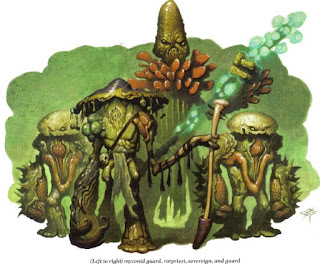 Fungaloids: These creatures look roughly like a cross between a man and a mushroom. They have a set of arms and legs which are made of wrapped and knotted mycelia. Their stalks are thick and their caps are stubby in comparison to other mushrooms. They have a savage intelligence, somewhere between pack animals and man. They have no verbal communication, rather they communicated by small clouds of psychoactive spores. They are broken up into colonies, each lead by an immobile mold like queen. They eat anything dead, standing immobile over the corpse, their tendrils wrapped all over it. On a clear day if one looks out from the tops of the Ubershrooms they often see whole Fungaloid colonies on the move, their queens held high above their caps marching to the next corpse fall.